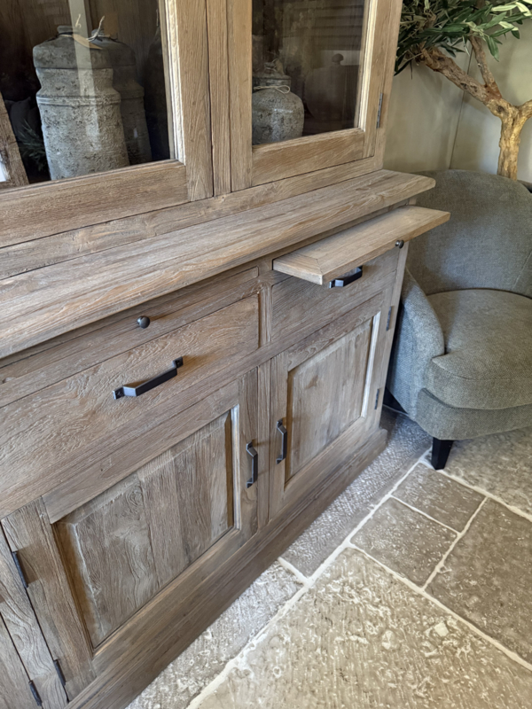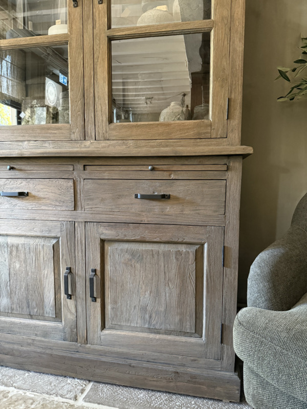 Schitterende stoere buffetkast oud vergrijsd teak met houten deuren, lades en uitschuifplanken.