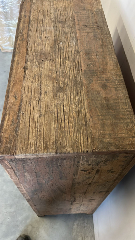 De combinatie van het grove hout met de hand gesmede onderstellen en handgrepen zorgen voor een uniek contrast en een extra stoere look en feel. Let wel op; dankzij dit grove hout zal het meubelstuk nooit 'splinter-vrij' zijn en is geen enkel item hetzelfde. Het geleverde exemplaar kan dan ook licht afwijken van het getoonde.