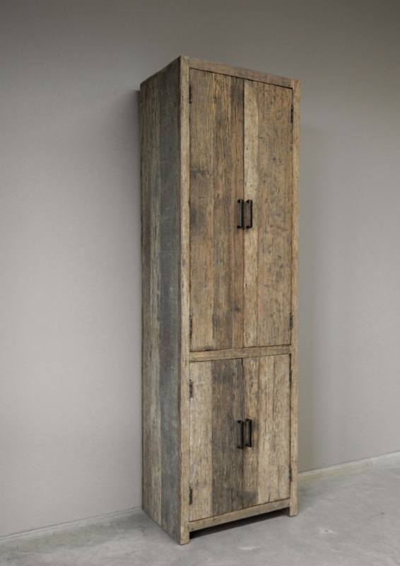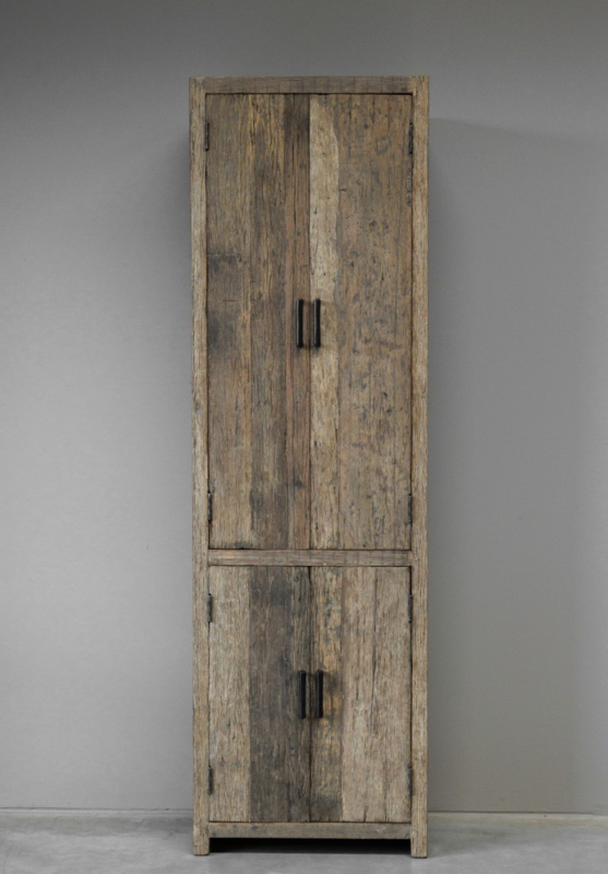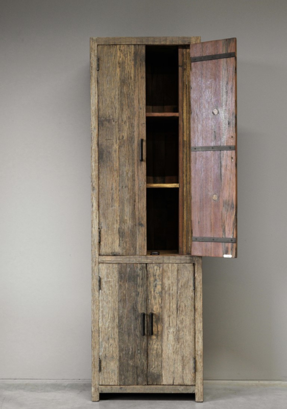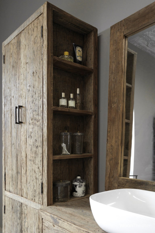 Het badkamer meubel is gemaakt van rustiek oud hout.