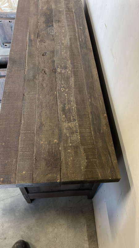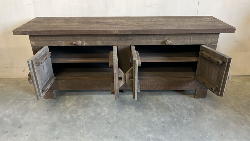 Stoer tvmeubel van oud robuust hout. Voorzien van 4 lades met stalen greepjes.