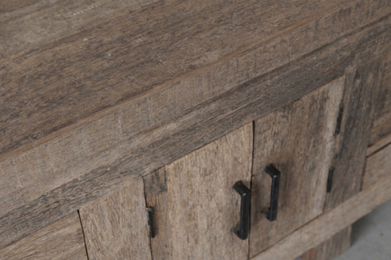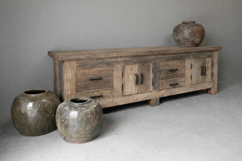 Stoer tvmeubel van oud robuust hout 220 cm. Deze tafel is onderdeel van onze "Levv" serie. We hebben van deze meubels tafels, tvmeubels, ladenkastjes, kastjes etc