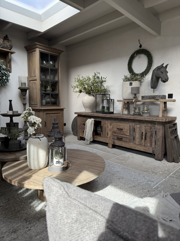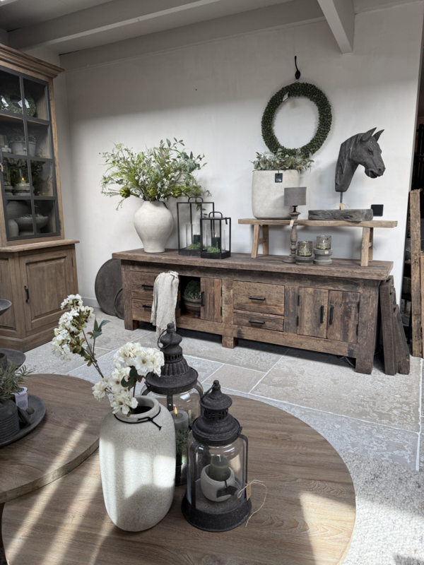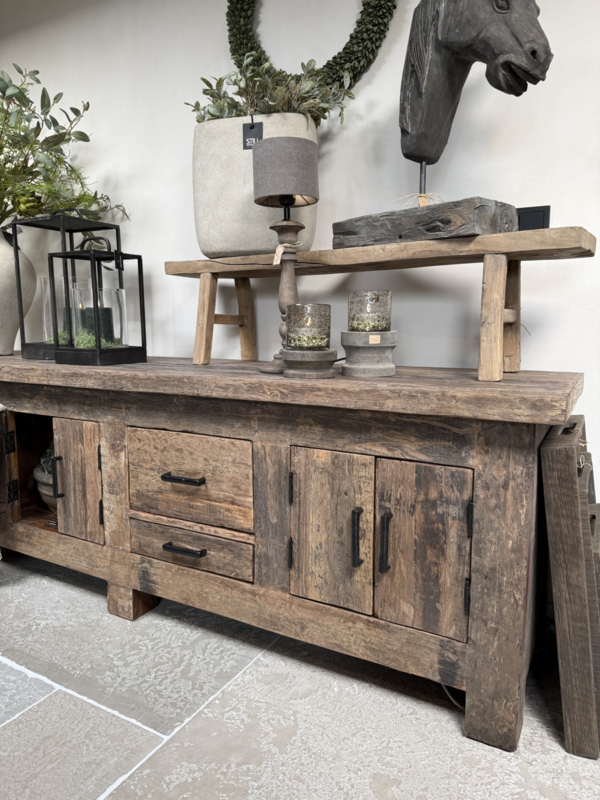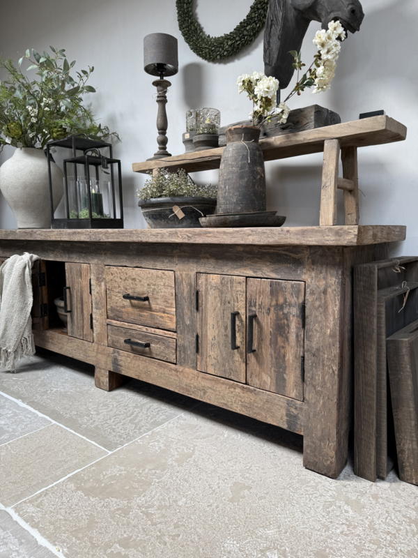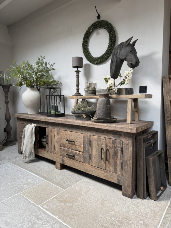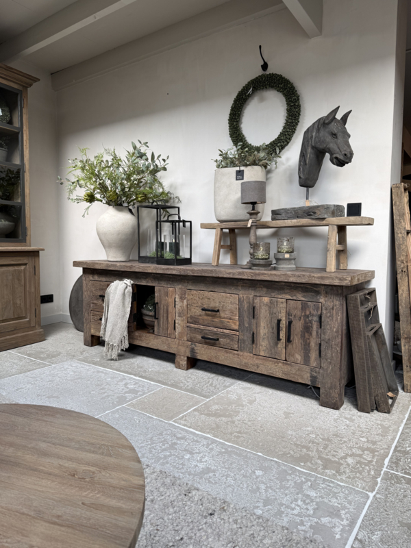Stoer tvmeubel van oud robuust hout 220 cm. Deze tafel is onderdeel van onze "Levv" serie. We hebben van deze meubels tafels, tvmeubels, ladenkastjes, kastjes etc
