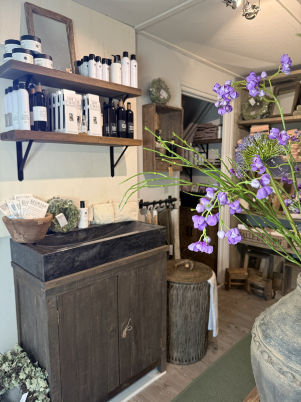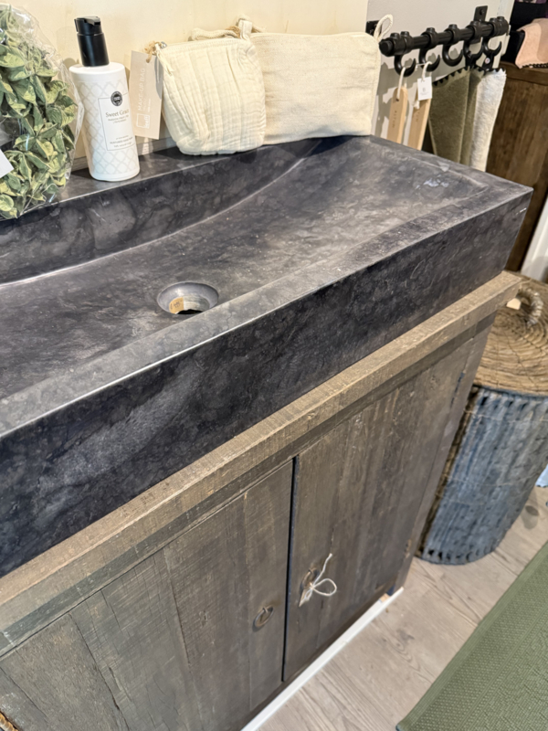 Het badkamer meubel is gemaakt van rustiek oud hout.