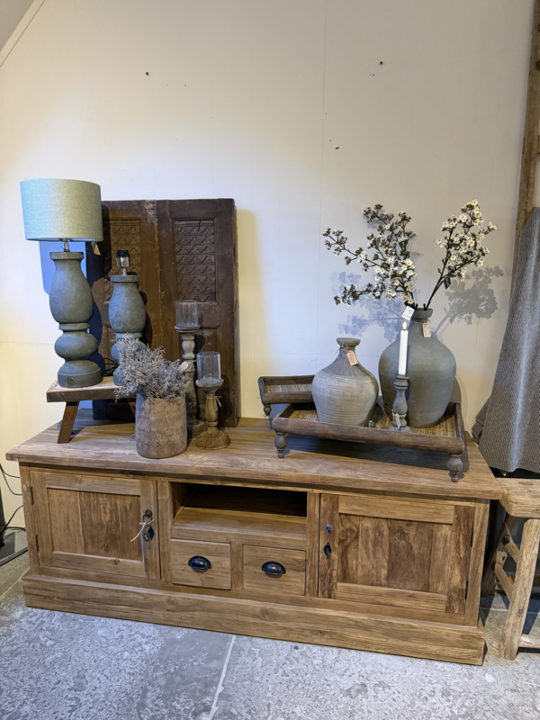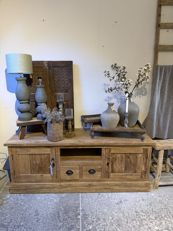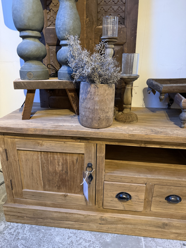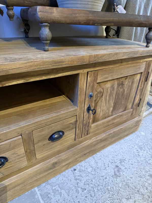 Stoer tvmeubel van oud teakhout. Mooi doorleefd hout in een warme bruine kleur.