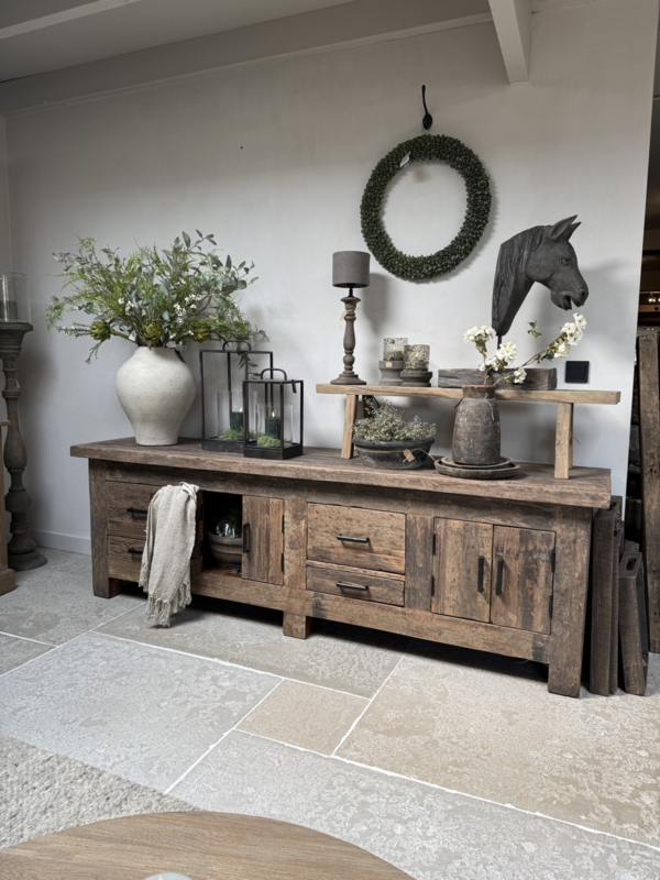 Stoer dressoir van oud robuust hout, mega XXL blikvanger. De maat is: Lengte 275 cm Diepte 50 cm Hoogte 95 cmOp bestelling leverbaar, de levertijd is op aanvraag. ---------- Wanneer wij dit meubel op voorraad hebben en deze…